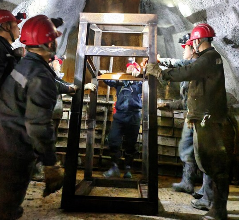 在840中段,燕子巖礦段老系統(tǒng)下礦口和建井隊(duì)工人一起搬運(yùn)振動(dòng)漏斗支架,協(xié)助工人進(jìn)行安裝,林書記囑咐一定要多注意安全。