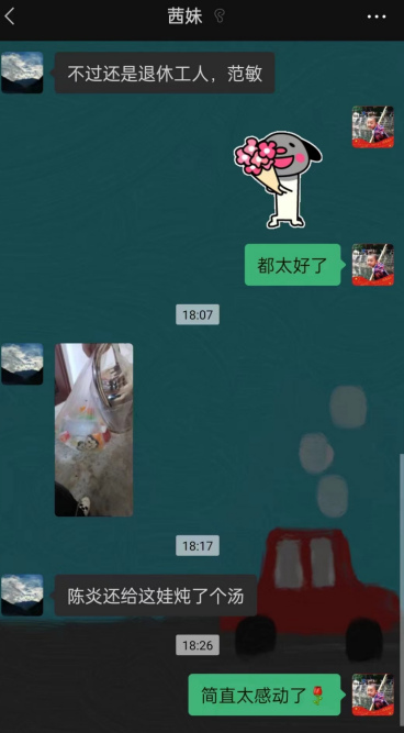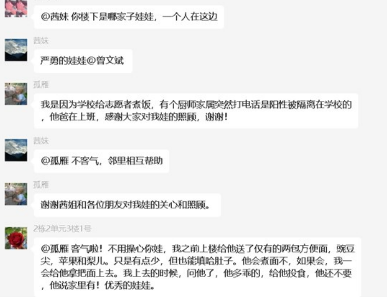 而在昊華家園的業(yè)主群里,當(dāng)組織人事部陳麗得知嚴(yán)勇兒子的事之后,也為他兒子送去了方便面、水果。大家在群里除了關(guān)心他生活物資夠不夠,還特意囑咐孩子正在長(zhǎng)身體的時(shí)候,營(yíng)養(yǎng)也一定要跟上。
